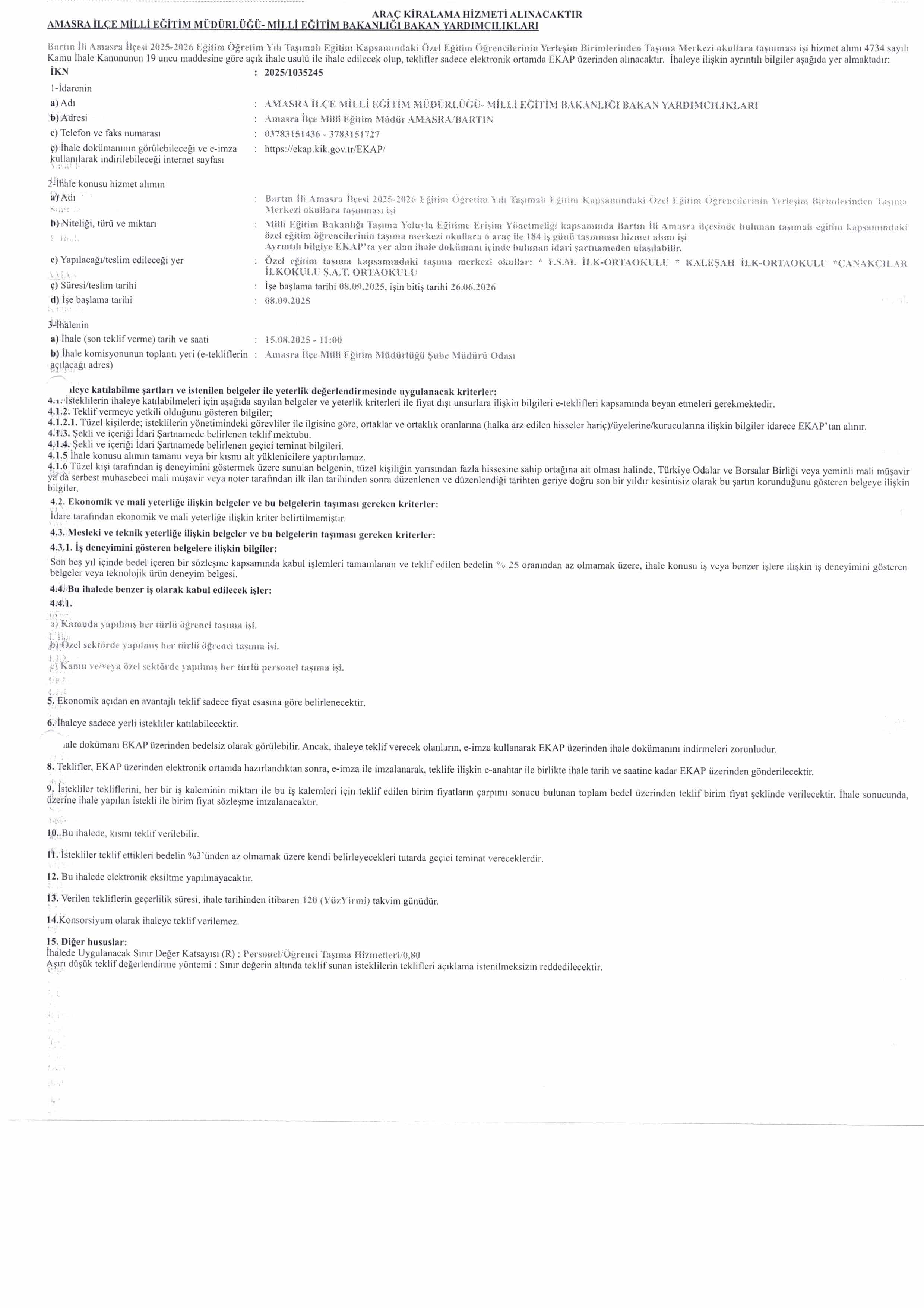 BARTIN İLİ AMASRA İLÇESİ 2025-2026 EĞİTİM ÖĞRETİM YILINDA TAŞIMALI EĞİTİM KAPSAMINDAKİ ÖĞRENCİLERİN YERLEŞİM BİRİMLERİNDEN TAŞIMA MERKEZİ ÖZEL EĞİTİM ÖĞRENCİLERİ TAŞINMASI İŞİ